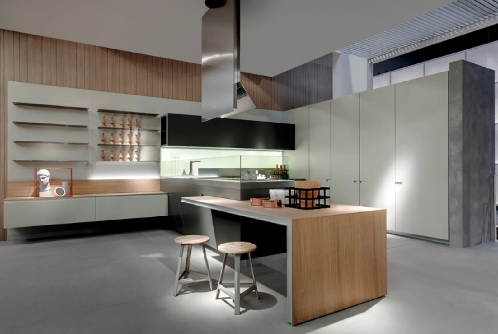 Il designer italiano simone micheli ha creato una versione moderna di un favoloso arredamento da cucina di alta gamma che segue la filosofia euromobil living and cooking .